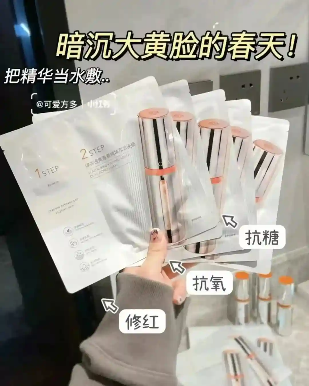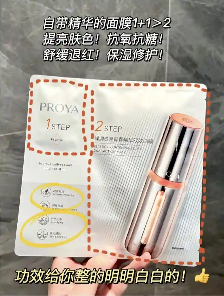 它是一涂二敷的两部曲设计,先均匀的涂上抗氧抗糖精华液,再敷上舒缓修红的面膜,就可以尽情享受提亮、修护大佬们呵护皮肤啦~
