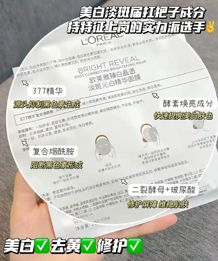 它里面含有8️⃣种高效美白成分,377和烟酰胺这种芋妮们都熟知的王牌美白成分它都有,这就打败大部分美白面膜了!