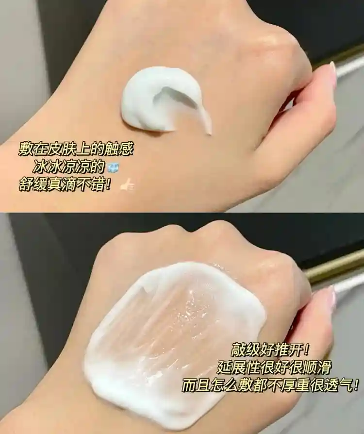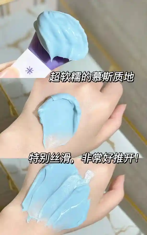 淡蓝色的奶油慕斯质地,比老版更顺滑好推开,敷起来冰冰凉凉的特别舒服,感觉在给皮肤快速降温~