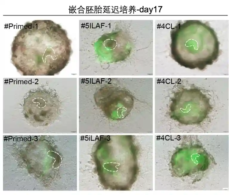 团队将注射了其中两个体系的干细胞的嵌合胚胎分别在体外延迟培养到第17天,发现注射的胚胎干细胞仍然可以高效存活,单细胞测序表明猴胚胎干细胞可以与受体胚胎细胞同步发育,并且贡献到第17天猴胚胎的不同细胞谱系中。