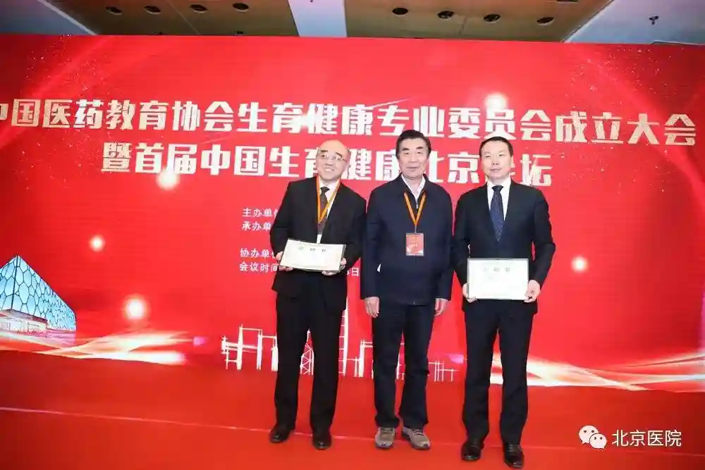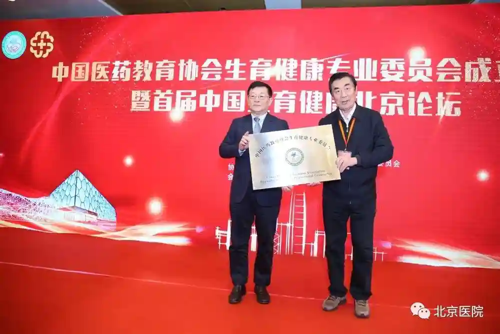 中国医药教育协会黄正明会长为生育健康专业委员会授牌,北京医院院长王建业教授接牌。