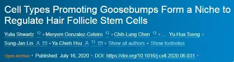 研究人员发现鸡皮疙瘩的出现需要毛囊干细胞、竖毛肌和交感神经的协同作用,毛发的生长也是类似的机制。交感神经分泌去甲肾上腺素调节毛囊干细胞活性,而竖毛肌维持交感神经和毛囊干细胞的相互作用。