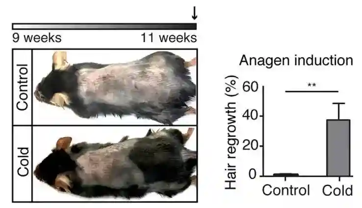 寒冷可提高交感神经活性,从而引发鸡皮疙瘩。研究人员继而做出假设,寒冷或许可提高交感神经活性,激活毛囊干细胞,促进生发。