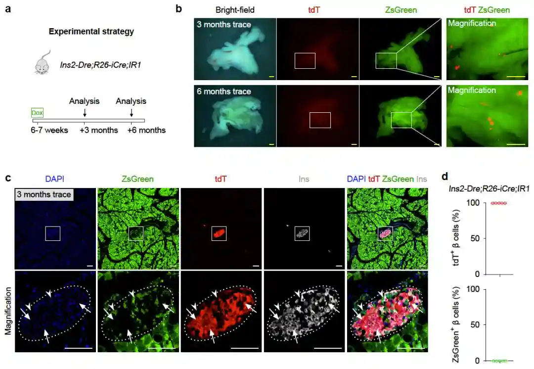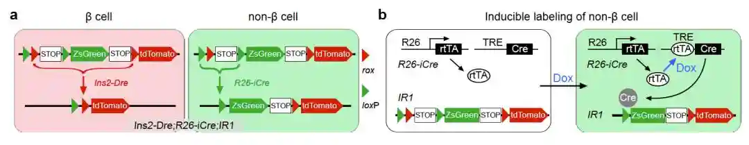 研究人员使用实验室构建的正交位点特异性双同源重组系统Cre-loxP和Dre-rox的交叉型报告小鼠IR1。在IR1报告小鼠中,两对重组识别位点(rox和loxP)交错排列,这样,一次成功的重组可以诱导表达一种遗传报告基因,并且还阻止了另一次重组的发生。该设计可以用两个不同的永久遗传标记同时区分标记beta细胞和非beta细胞:tdTomato和ZsGreen。
