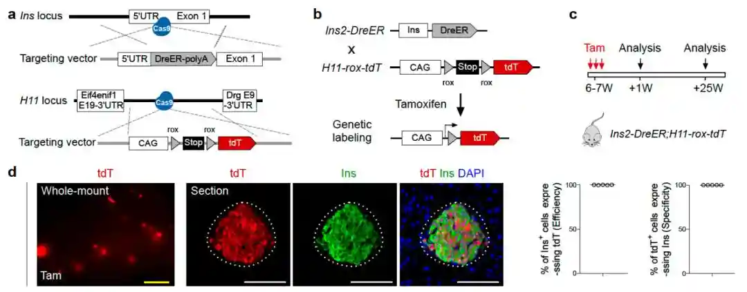 研究人员构建了新的特异性诱导型Ins2-DreER基因敲入小鼠品系和靶向Hipp11(H11)基因座的报告基因工具小鼠H11-rox-tdTomato。在成体阶段通过他莫昔芬诱导beta细胞进行遗传标记(tdTomato),那么其他非beta细胞为tdTomato阴性。在一段时间之后,如果有tdTomato阴性的非beta贡献产生新的beta细胞,它们将表达Insulin,因为此时已经没有他莫昔芬发挥作用而不会被tdTomato标记上。该策略的精确度很大程度上取决于beta细胞诱导标记效率。如果beta细胞标记的饱和度非常接近100%(比如99.9%),当tdTomato阴性的beta细胞的百分比显著增加(超过0.1%),则可以解释为新的beta细胞产生于干细胞。