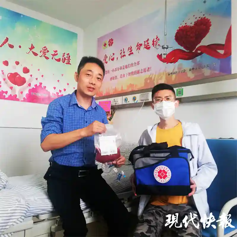 △卞伟伟将装有自己造血干细胞混悬液的特制袋交给专门对接的志愿者