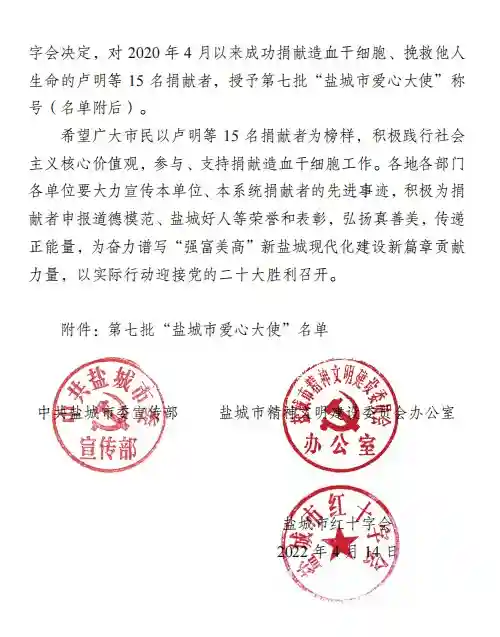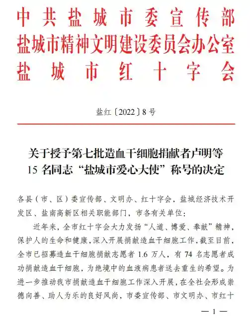 现代快报讯(通讯员王金海记者姜振军)现代快报记者从盐城市文明办获悉,在第75个“5·8”世界红十字日前夕,为进一步推动盐城市捐献造血干细胞工作深入开展,在全社会形成崇德向善、助人为乐的良好风尚,盐城市委宣传部、市文明办、市红十字会近日联合发文,授予卢明等15名同志第七批“盐城市爱心大使”荣誉称号。