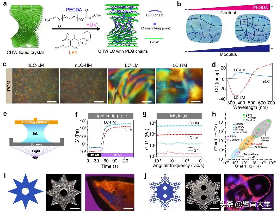 不同组成液晶墨水的性能研究(a~h)与异形件打印(i,j)