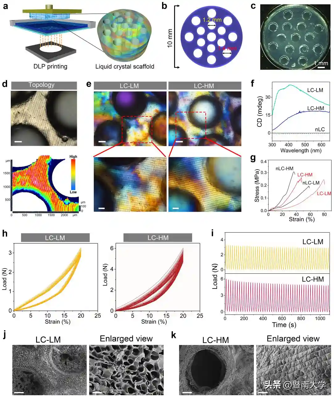 图3DLP打印液晶支架材料的示意图及实物照片(a~c)、液晶性能(d~f)、力学性能(g~i)与形貌(j,k)