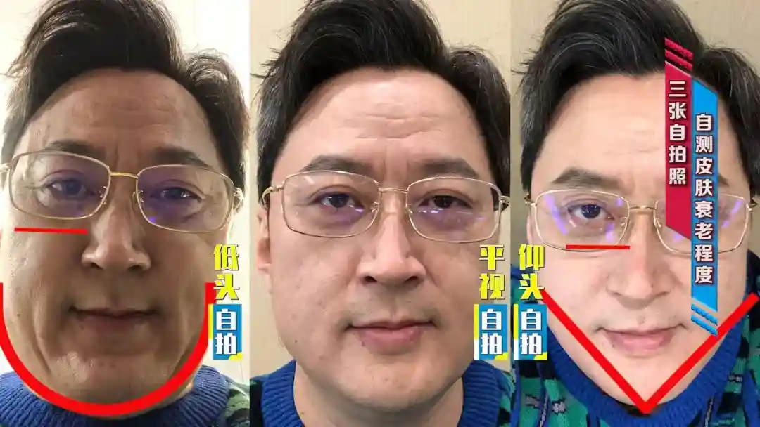 拍完后对比三张照片,如果差别越大说明皮肤越松弛越老化。具体您可以观察这两个部分:①看下半部分脸的形状变化,如果能很明显的看到脸型从u到v的变化,那就说明皮肤的松弛程度需要注意了,而皮肤松弛就是老化最主要的表现;②看眼睛下方的部位,如果低头时有比较明显的“卧蚕”,而仰头时没有,也说明皮肤存在一定的老化了!