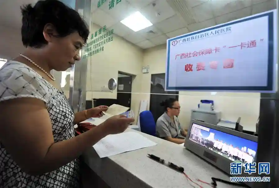 在广西壮族自治区人民医院,从北海到南宁异地就医的郑晓荣持社会保障卡在结算医药费(2015年6月30日摄)。