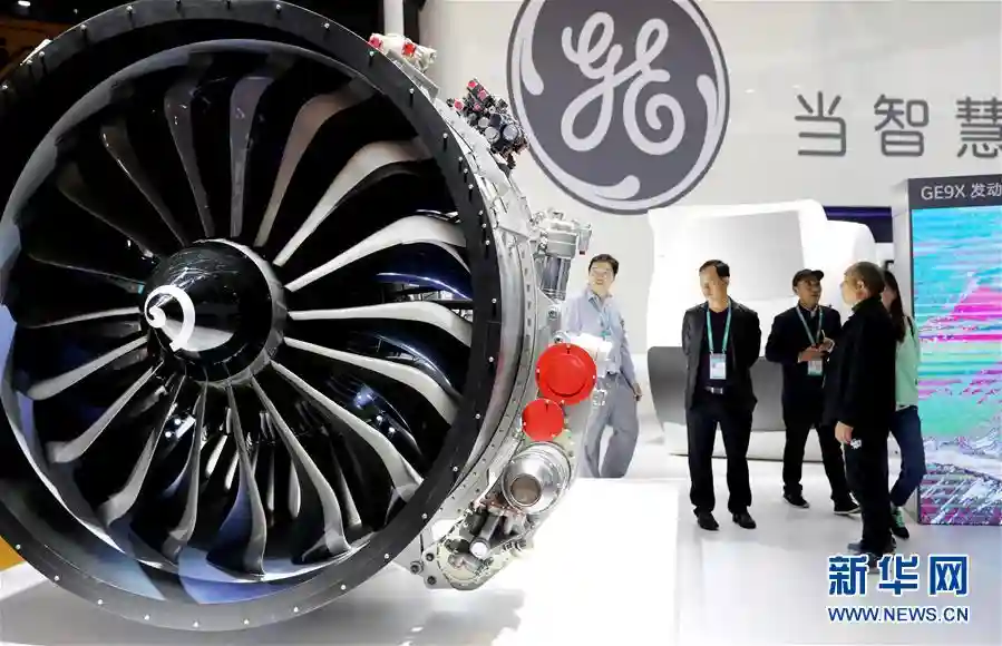 参观者在上海举办的首届进博会智能及高端装备展区观看展出的飞机发动机模型(11月5日摄)。
