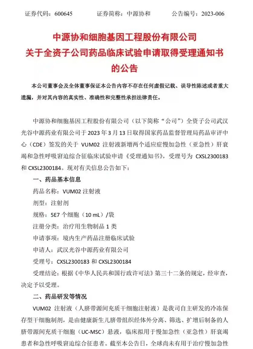 中源协和细胞基因工程股份有限公司旗下全资子公司武汉光谷中源药业有限公司于2023年3月13日取得国家药品监督管理局药品审评中心(CDE)签发的关于VUM2注射液新增两个适应症慢加急性(亚急性)肝衰竭和急性呼吸窘迫综合征临床试验申请《受理通知书》,受理号为CXSL2300183和CXSL2300184。