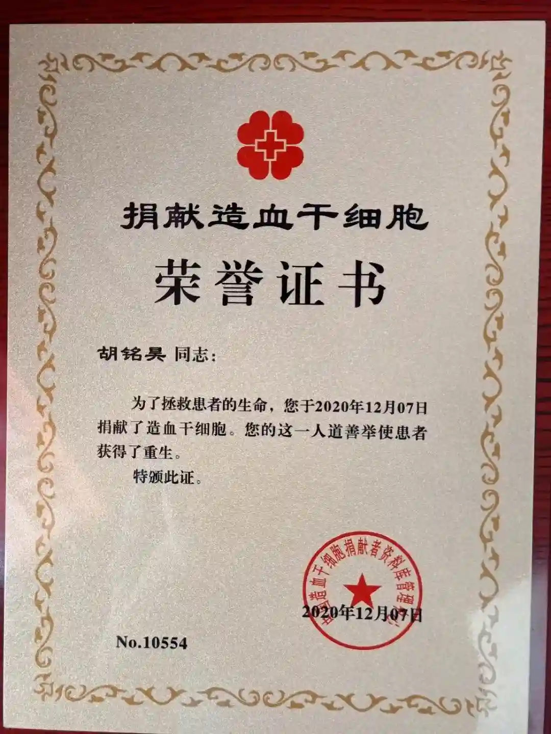 “当时就想,如果有一天我能跟某位患者配型成功,我将毫不犹豫地捐献造血干细胞。”胡铭昊说。