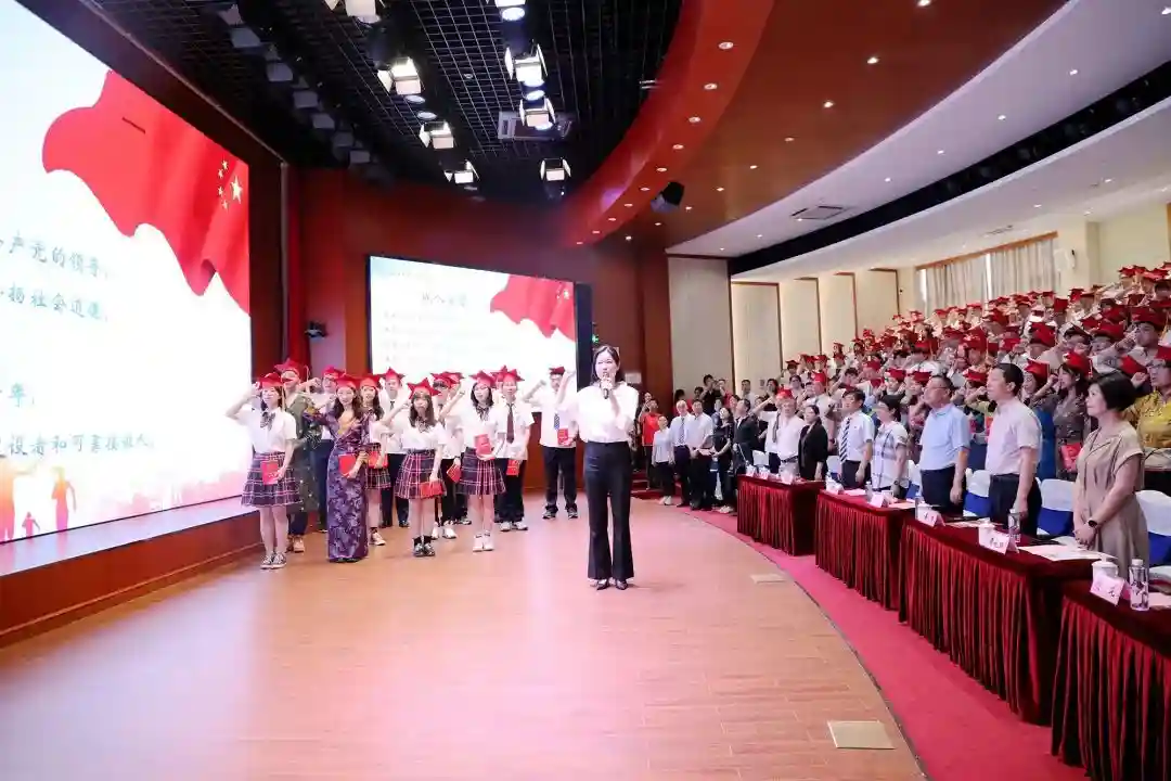 成人仪式上,曹立强、姜坚等为学生代表戴成人纪念帽;姜坚向学生代表授《中华人民共和国宪法》。402名学生面向鲜艳的五星红旗,庄严宣誓,宣告正式步入十八岁成人行列,郑重担负起公民的责任。