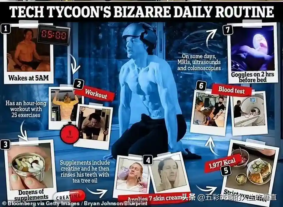 2021年开始,他组建了一支30人的专业团队,每年花费1500万,通过控制卡路里、锻炼、甚至全身大换血、编辑DNA等疯狂行为,