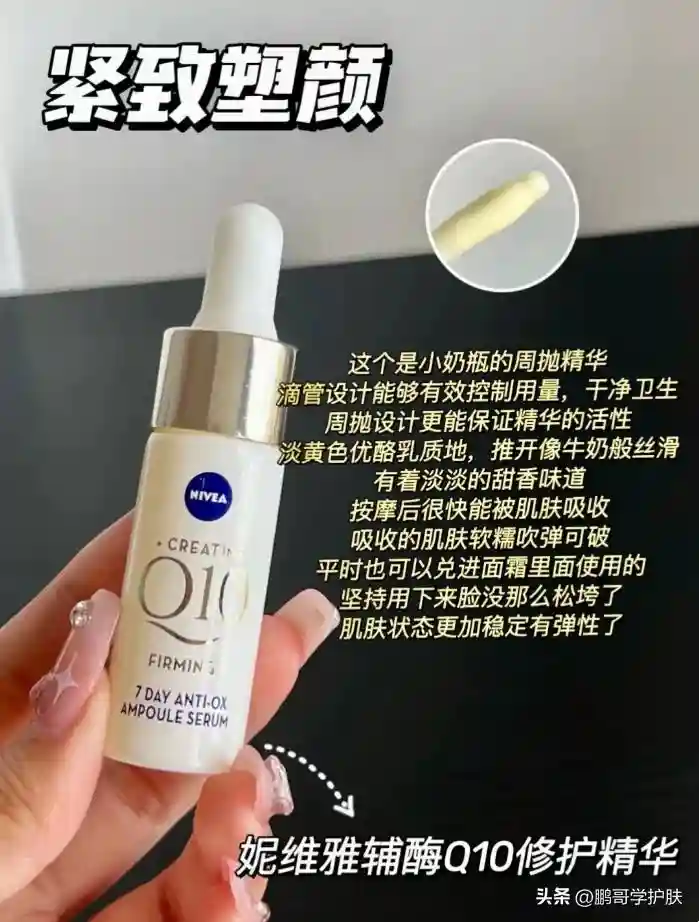 妮维雅小Q瓶精华是真的猛料了,有98%纯度的辅酶,辅酶Q10补充20倍抗氧化力,5倍胶原蛋白促生成分肌酸。妮维雅小Q瓶精华就是通过补给肌肤结构一致的Q10,对肌肤友好容易被吸收,有效对抗暗沉松弛,抵御肌肤衰老。