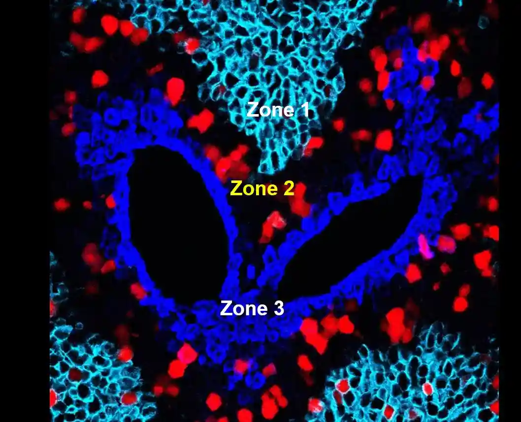 由此,研究组“一锤定音”:新生肝细胞主要集中在肝小叶的zone2中。“在追踪图片上看起来,这些增殖细胞集中的区域,就像一个个迷你甜甜圈。”何灵娟说。