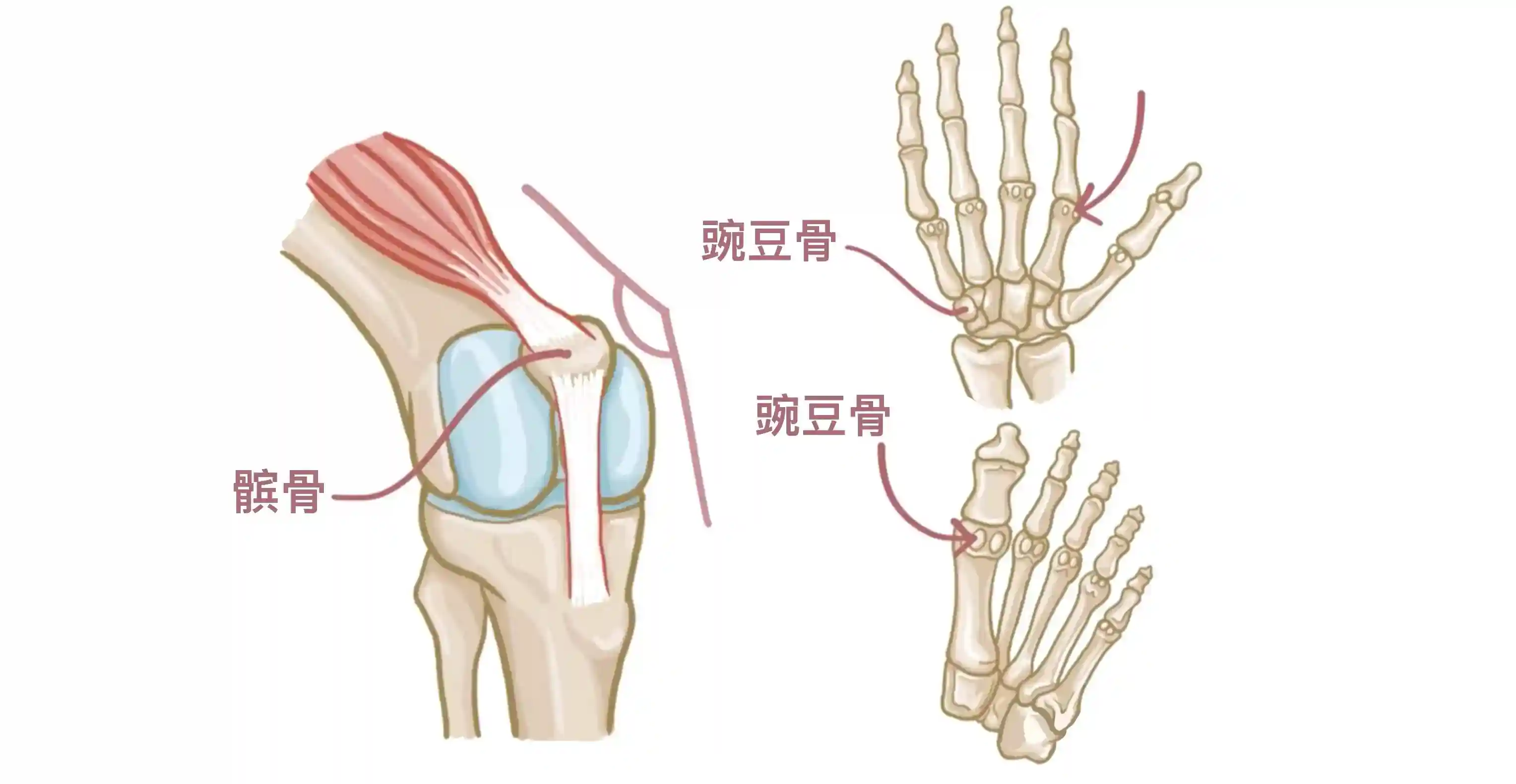 较大的籽骨包括腕部的豌豆骨和髌骨(膝盖骨)。