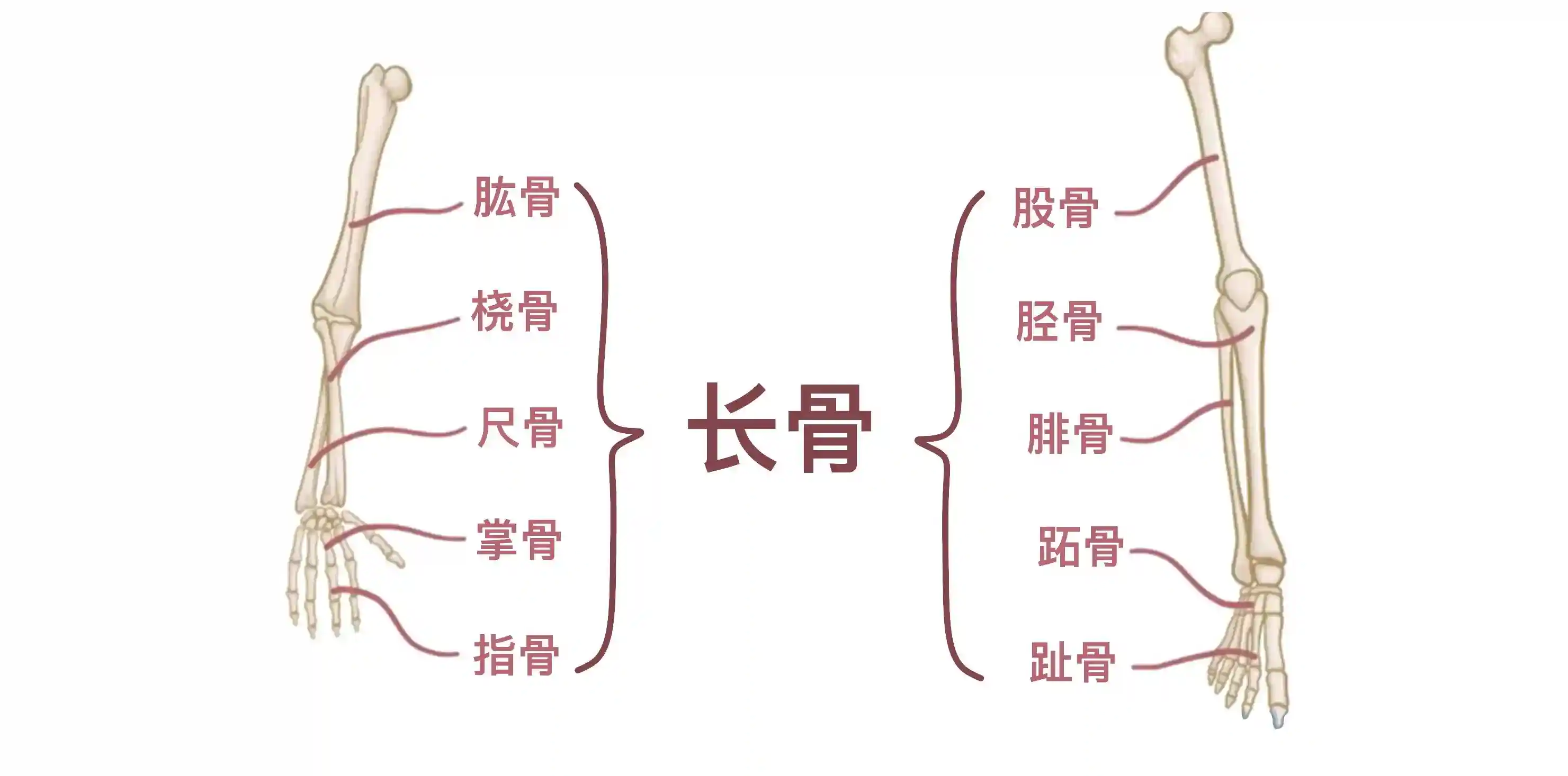 长骨也包括股骨、胫骨、腓骨,以及足部和脚趾的跖骨和趾骨。