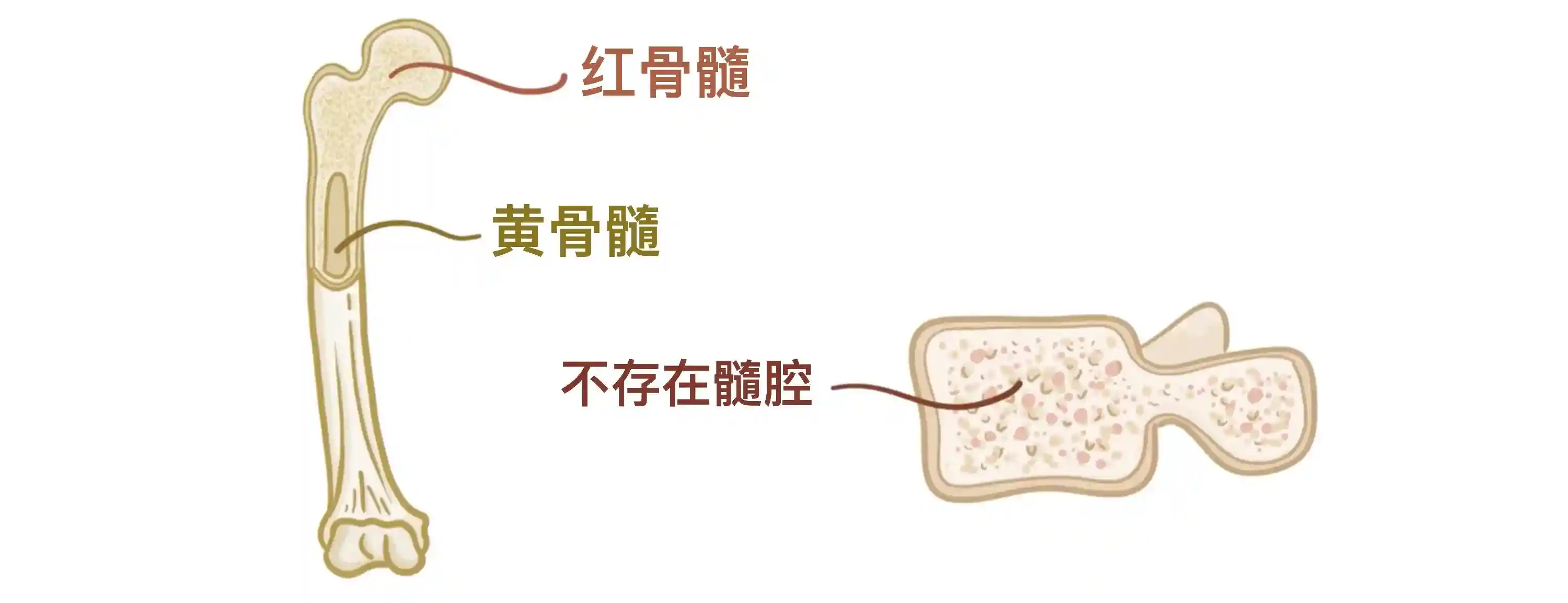 形成附肢骨的骨中,比如股骨,红骨髓大部分位于骨的末端,而骨干则包含充填着黄骨髓的髓腔。