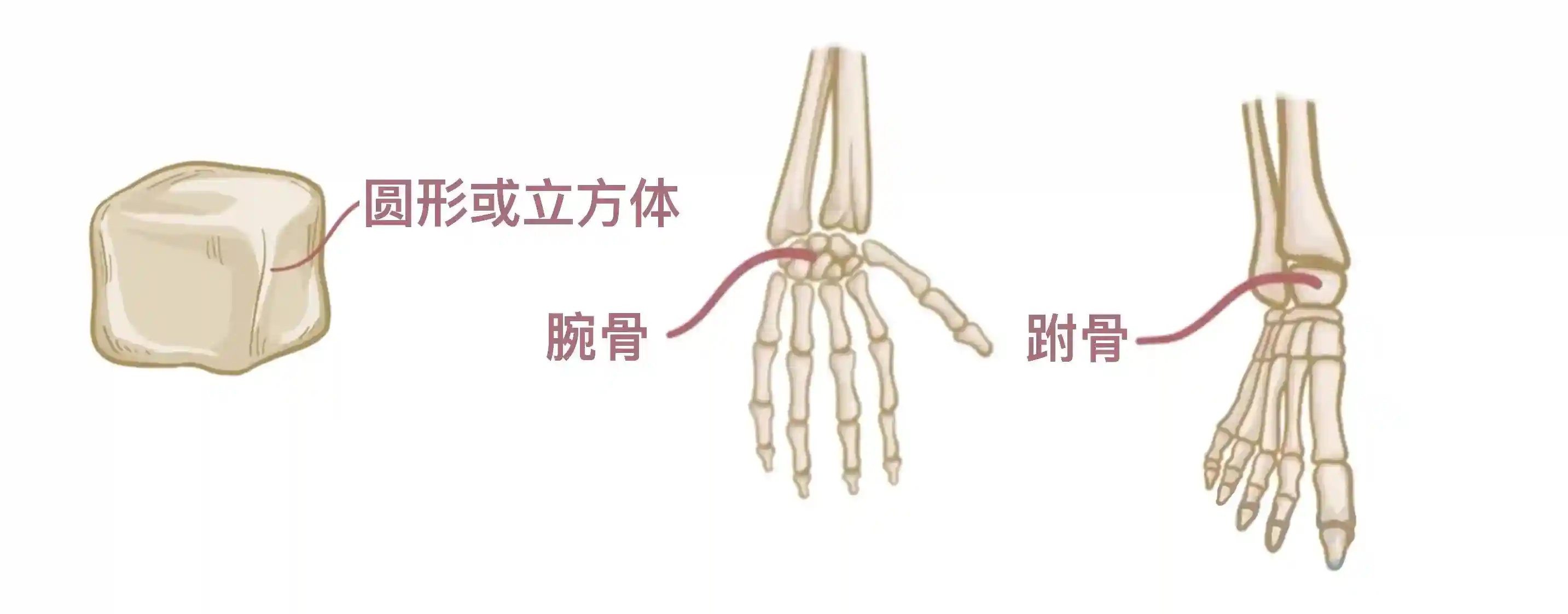 与长骨不同,短骨的长度和宽度相仿,这赋予了它们圆形或立方体的外观。它们包括腕部的腕骨和踝部的跗骨;其主要功能是支持手部和足部。