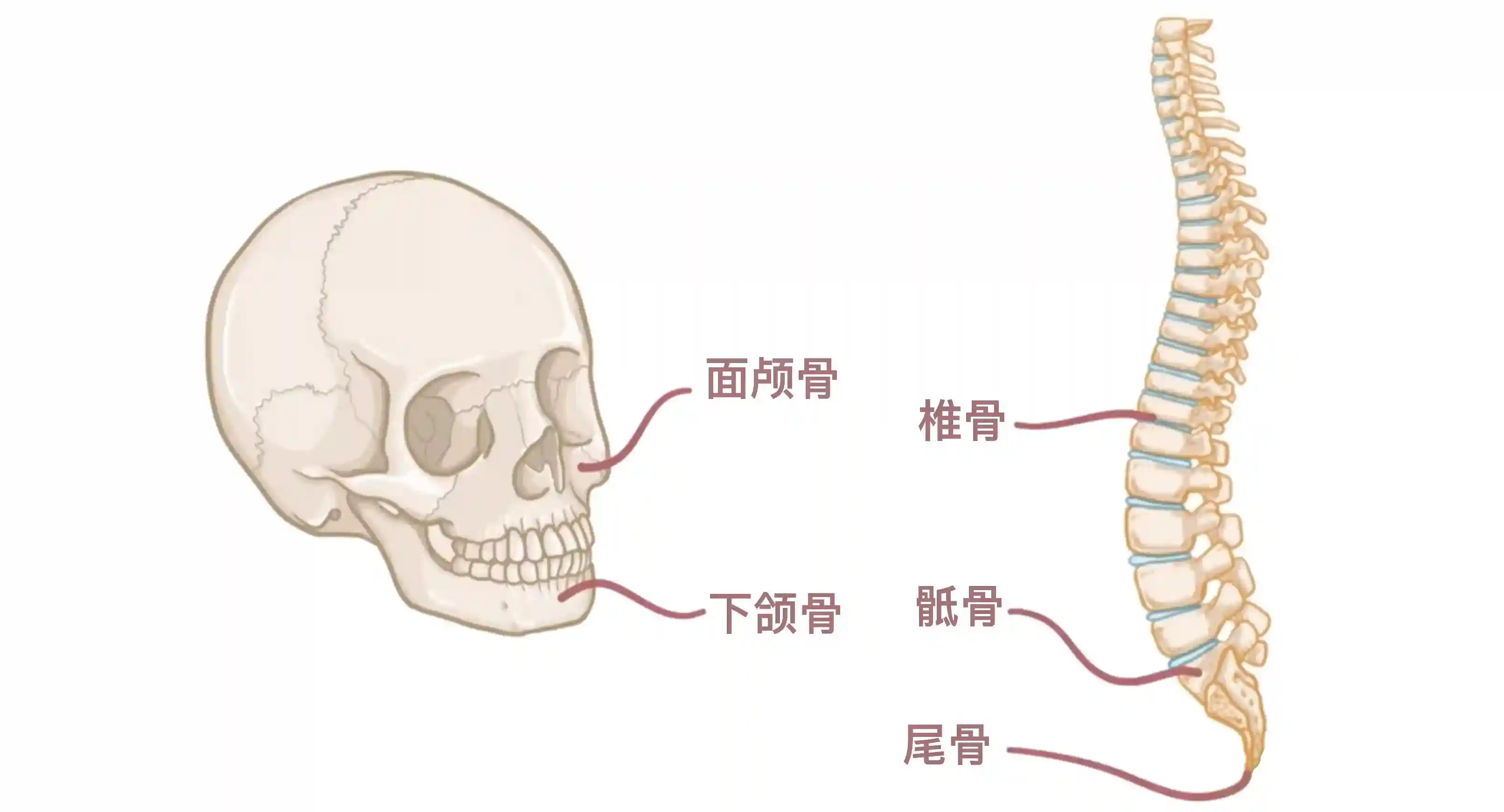 最后一类骨是不规则骨,主要是不适合纳入上述任何分类的骨。它们包括面颅骨、下颌骨、脊柱的椎骨以及骶骨和尾骨。