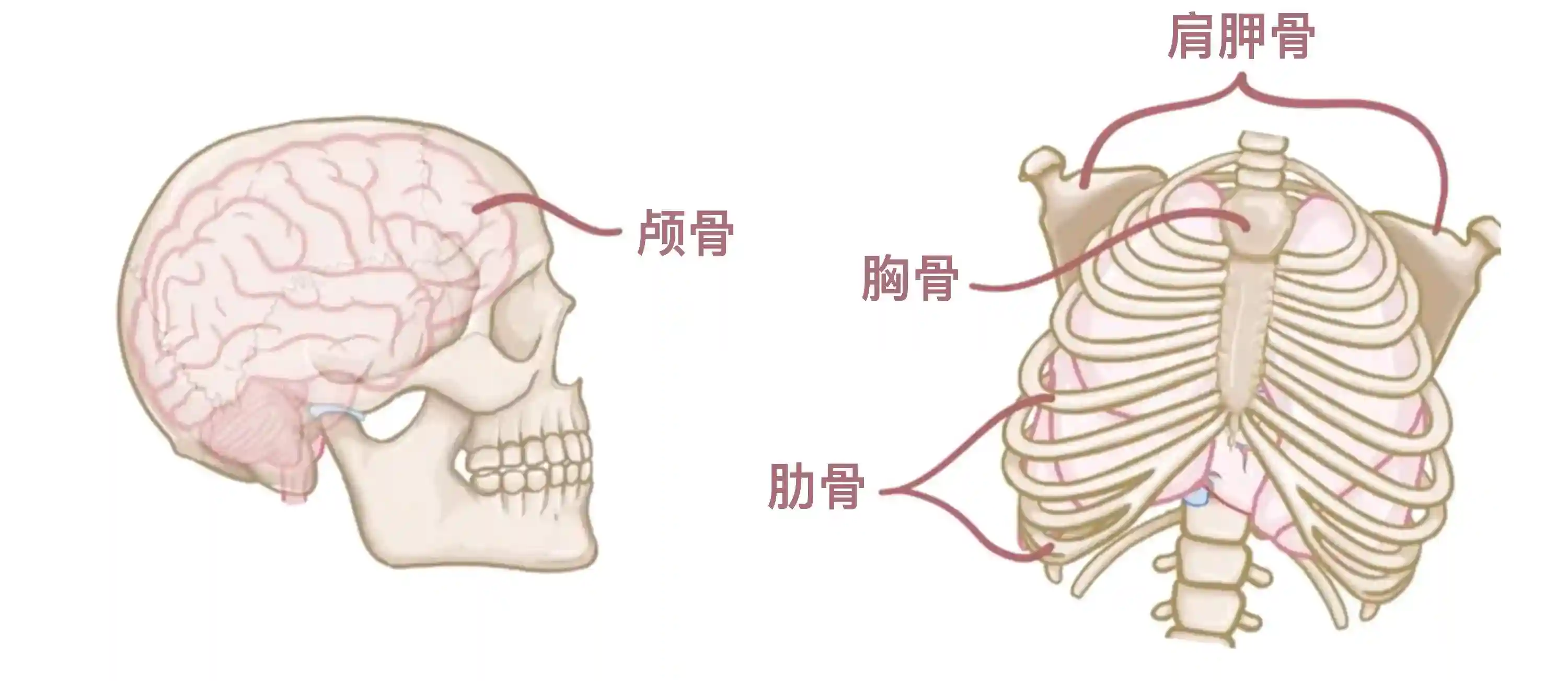 扁骨是属于比较薄的骨头,其中一些还是弯曲的。它们包括颅骨、肩胛骨、胸骨和肋骨。它们的主要角色是作为“装甲”来保护人体的重要脏器,比如颅骨保护脑,胸骨和肋骨保护心和肺。