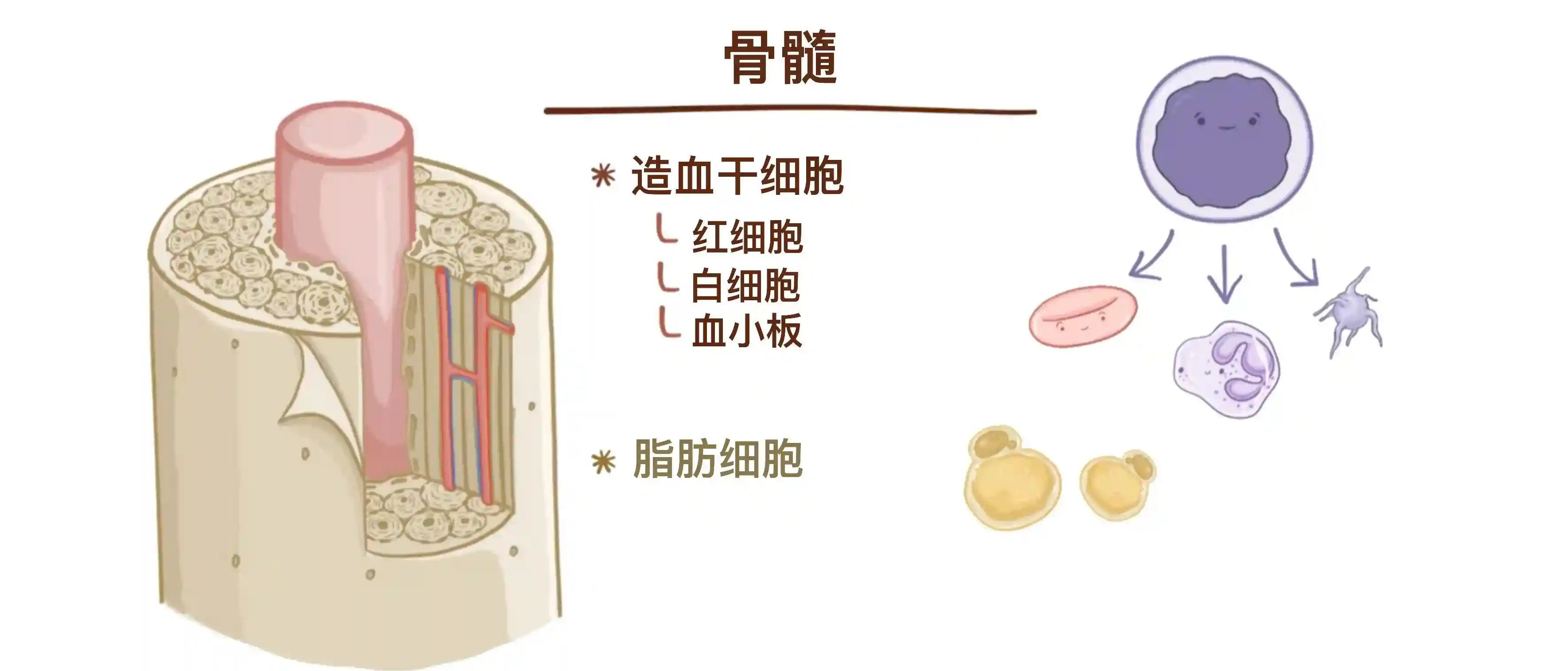 在松质骨层的内部是骨髓。骨髓由造血干细胞的混合物组成,它们最终分化为红细胞、白细胞和血小板。