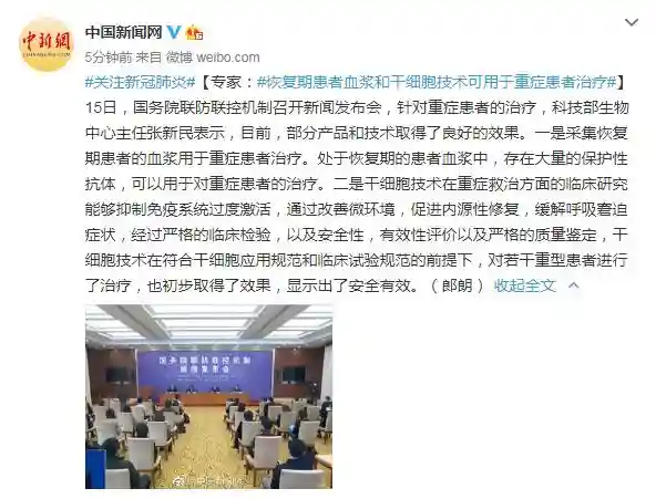【专家:】15日,国务院联防联控机制召开新闻发布会,针对重症患者的治疗,科技部生物中心主任张新民表示,目前,部分产品和技术取得了良好的效果。一是采集恢复期患者的血浆用于重症患者治疗。处于恢复期的患者血浆中,存在大量的保护性抗体,可以用于对重症患者的治疗。二是干细胞技术在重症救治方面的临床研究能够抑制免疫系统过度激活,通过改善微环境,促进内源性修复,缓解呼吸窘迫症状,经过严格的临床检验,以及安全性,有效性评价以及严格的质量鉴定,干细胞技术在符合干细胞应用规范和临床试验规范的前提下,对若干重型患者进行了治疗,也初步取得了效果,显示出了安全有效。(郎朗)