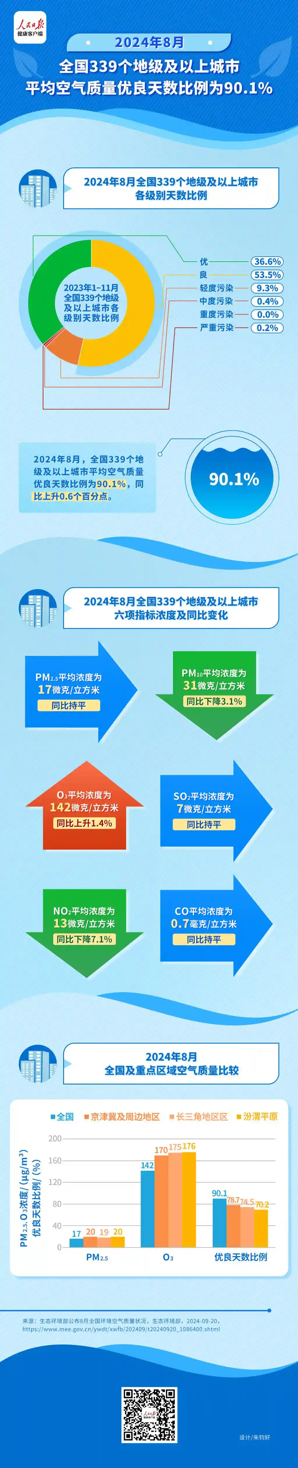 8月全国的环境空气质量状况公布9月20日,生态环境部向公布了8月全国的环境空气质量状况。据其公开的数据显示,8月全国339个地级及以上城市平均空气质量优良天数比例为90.1%,同比上升0.6个百分点。8月平均重度及以上污染天数比例为0.2%,同比下降0.1个百分点。