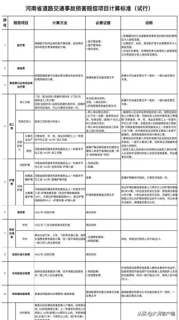 近日,河南省高级人民法院、河南省公安厅、河南省司法厅、河南银保监局四部门联合出台了《河南省道路交通事故损害赔偿项目计算标准和主要情形损害赔偿责任比例(试行)》。