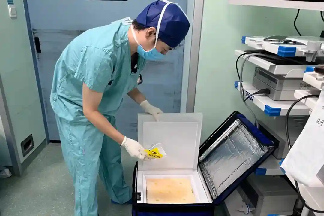 将切除的卵巢组织放入专业转运箱冻存