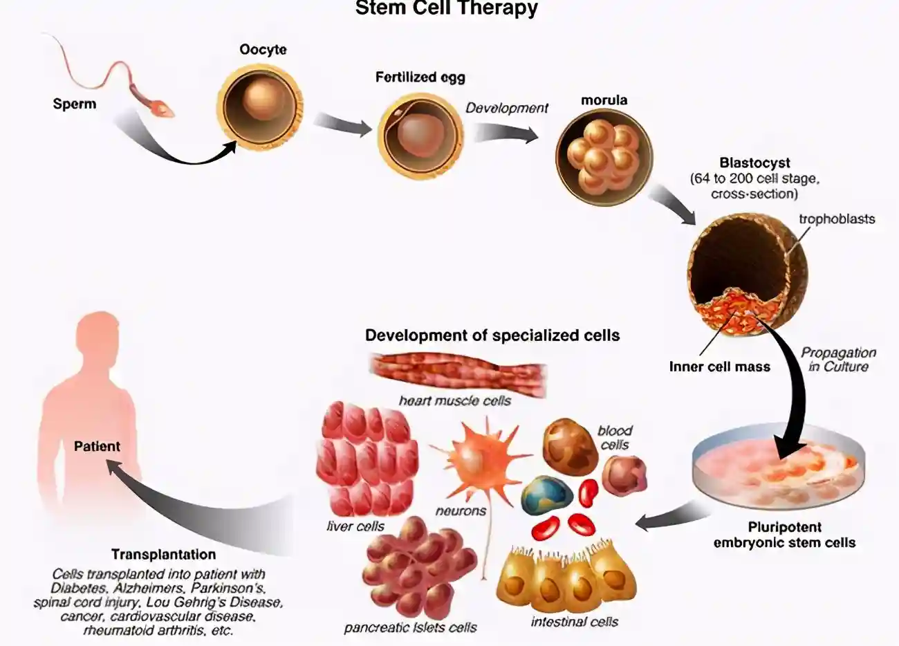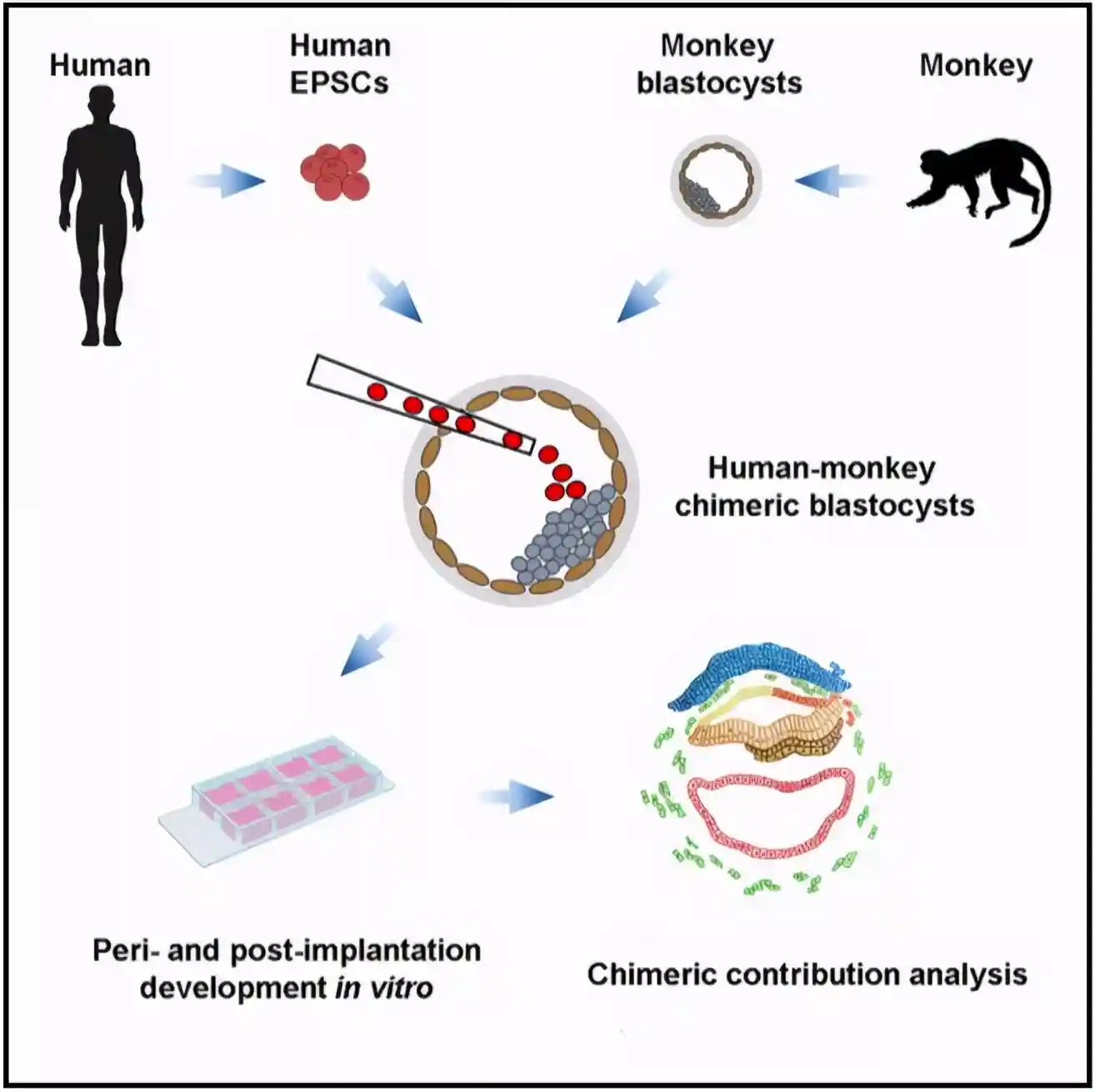 而这种机理就是人类制造人猴嵌合体、猪猴嵌合体、人羊嵌合体胚胎的原理。在猴子胚胎发育的早期阶段,胚胎细胞是全能细胞,可以发育为任何组织,而将人类的经过诱导产生的多能干细胞注入到猴子的早期胚胎中,有一定可能使人体细胞和猴子胚胎一起分化发育,使猴子的多种组织器官中出现人类细胞。
