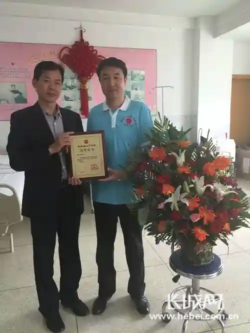 中华骨髓库河北分库主任陈日新为张海涛送来花篮表示慰问。长城网曹明摄