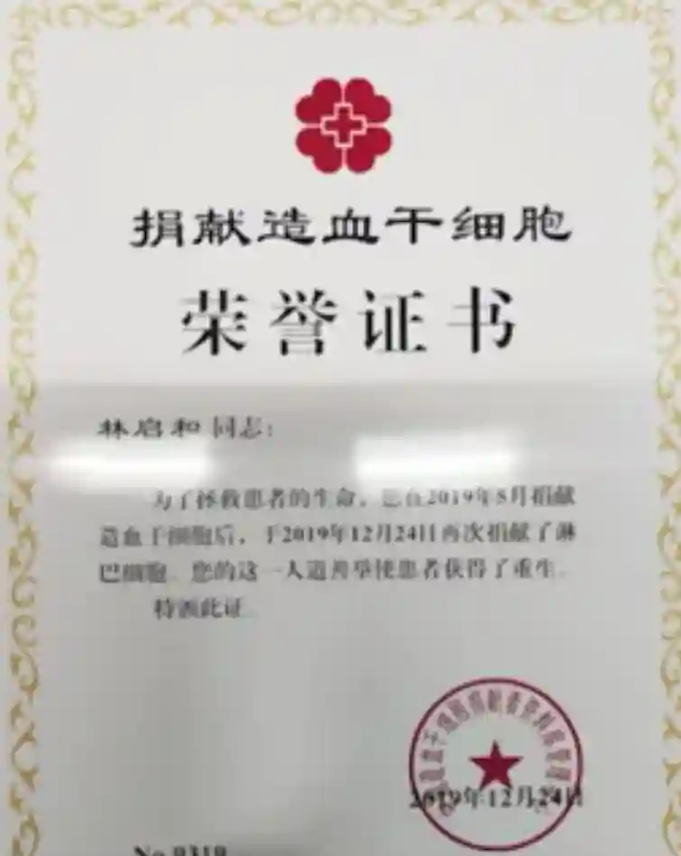 随后林启和一直和家人沟通,最终说服家人,开始第一次捐献造血干细胞,捐献造血干细胞,被称为再造生命的奇迹,在非血缘关系人群中,配对成功机率仅十万分之一,捐献挽救的不仅是患者的生命,更是一个完整幸福的家庭。