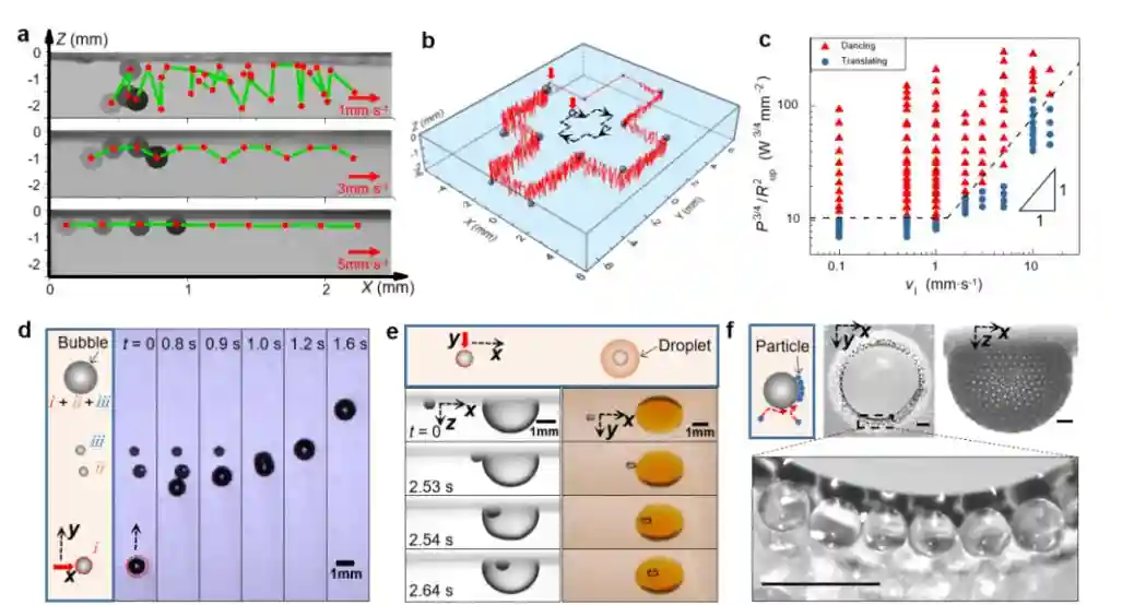 近日,航空航天系邓道盛/胡曼团队报道了一种激光驱动水下气泡三维弹跳运动的体系,利用纯水介质对980nm近红外激光的体吸收光热响应特性,结合固/液界面对流传热,构建了独特的逆温层区域,实现了气泡在液体内部作周期性原地弹跳以及跟随弹跳(翩翩起舞的气泡)的三维运动模式。相关成果以“Near-infrared-laser-navigateddancingbubblewithinwaterviaathermallyconductiveinterface”为题发表于国际顶级期刊《自然-通讯》(NatureCommunications)。
