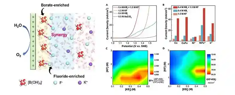 近日,龚鸣青年研究员课题组与华东理工大学练成研究员课题组合作发现在中性电解液中同时引入硼酸根离子(Bi-)和氟离子(F-),可改变电极/电解液界面微环境形成分级离子排列结构,进而显著提升中性析氧反应(OER)性能。研究发现使用易合成的Co(OH)2催化剂时,使用F-:Bi-=1.5:0.4的比例可产生强协同效应,比单阴离子添加的情形活性可提高接近一个数量级。这一研究成果以“Hierarchicalanionsattheelectrode-electrolyteinterfaceforsynergizedneutralwateroxidation”为题发表于Chem。
