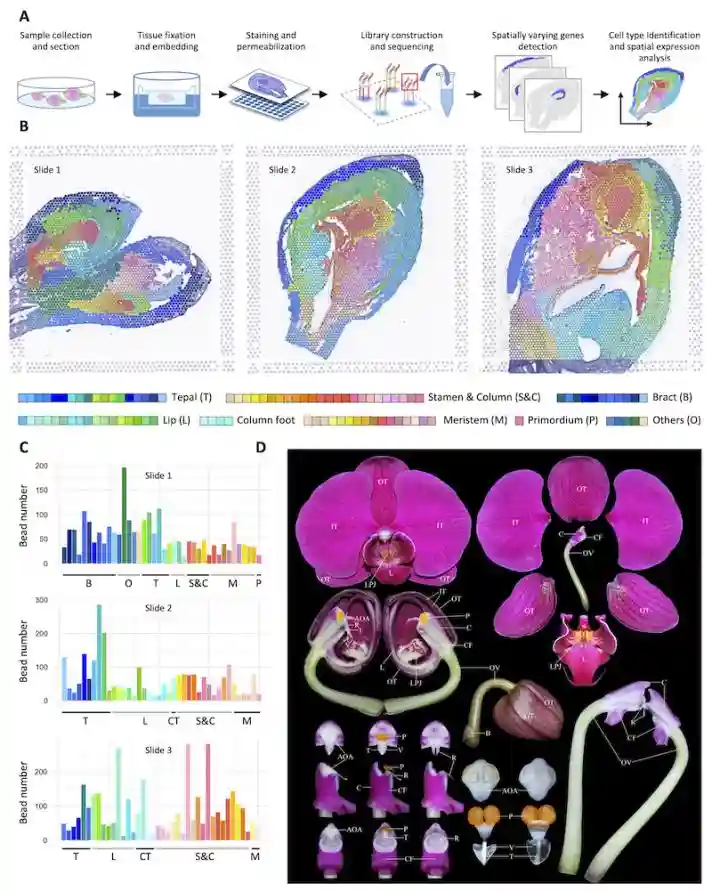 近期,戚继团队联合江西农大国春策团队揭示兰花器官起始和发育中基因调控的时空动态变化。研究团队首次将10XVisium技术应用于研究兰科植物蝴蝶兰(PhalaenopsisBigChili)的花器官发生与发育过程。该研究为理解花器官发生以及特定细胞类型的基因组学和遗传学研究提供了分子层面的信息,相关研究结果发表在NucleicAcidsResearch期刊上。