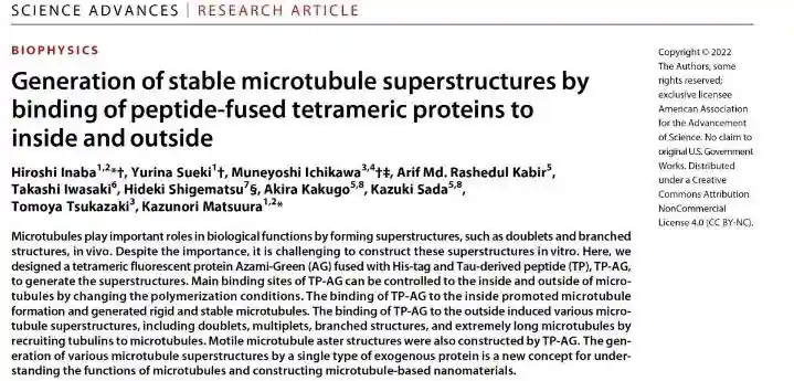 近日,生命科学学院市川宗严(ICHIKAWAMuneyoshi)青年研究员、于ScienceAdvances杂志在线发表了题为“Generationofstablemicrotubulesuperstructuresbybindingofpeptide-fusedtetramericproteinstoinsideandoutside”的研究论文。此项研究中,作者通过在外源四聚体荧光蛋白Azami-Green(AG)中加入与微管结合的序列,创建了一项可在体外构建多样化微管结构的新技术。