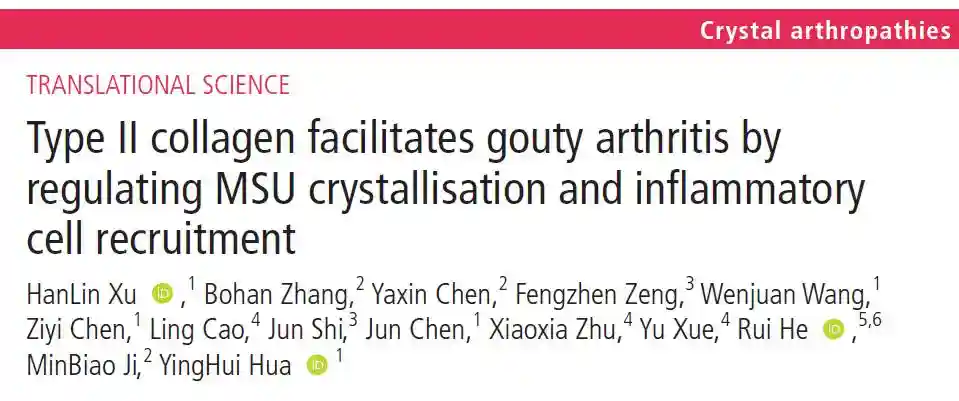 近日,附属华山医院运动医学科华英汇团队基于临床手术经验,联合非线性光学、风湿免疫、图像处理等领域团队开展研究,最新研究成果以TypeIIcollagenfacilitatesgoutyarthritisbyregulatingMSUcrystallizationandinflammatorycellrecruitments(《II型胶原蛋白通过调节尿酸钠结晶和炎症细胞募集促进痛风性关节炎》)为题,于风湿关节疾病领域著名期刊AnnalsofRheumaticDiseases(《风湿病学年鉴》)在线发表。